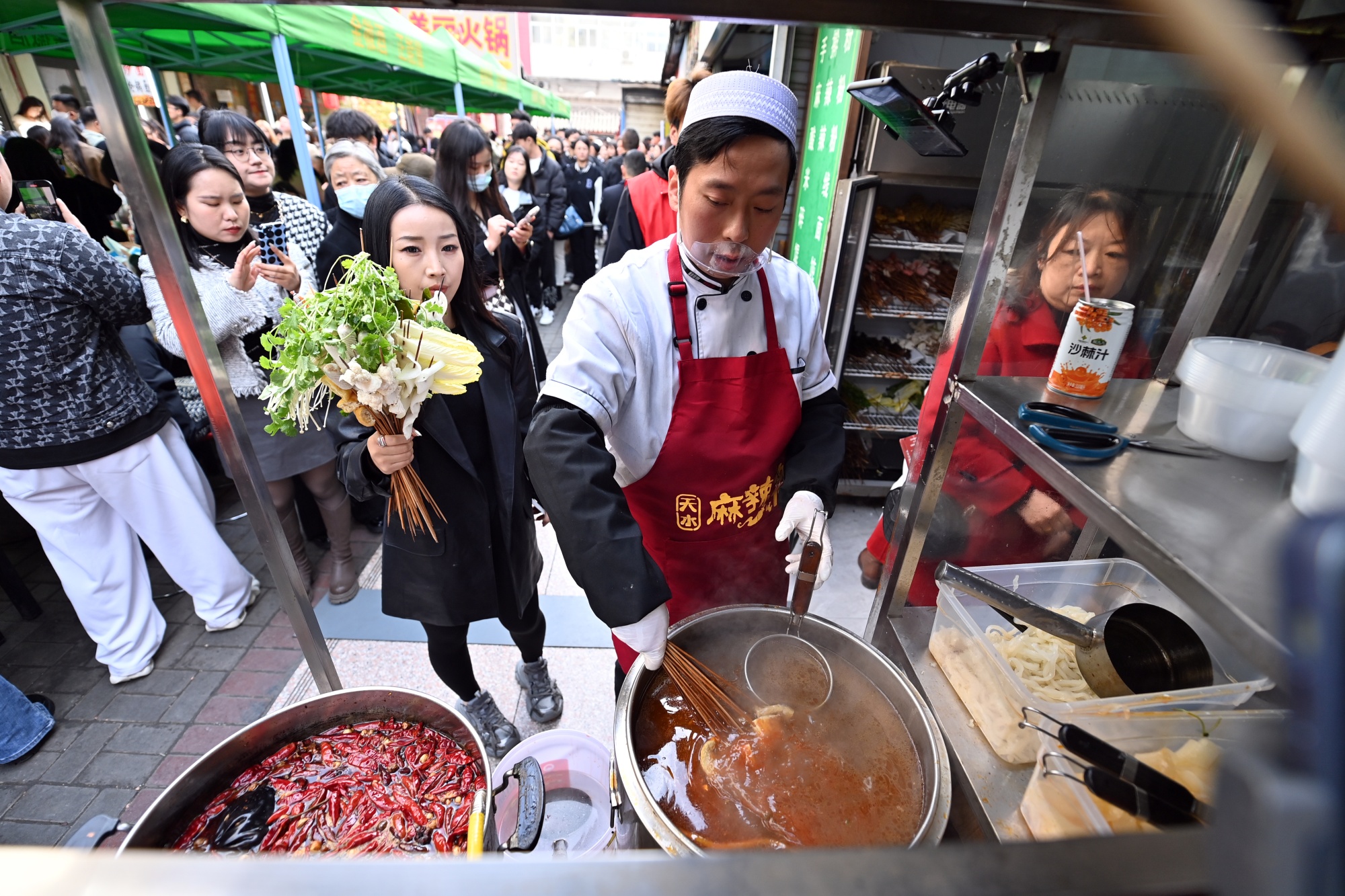 游客们于3月14日在甘肃省天水市享用麻辣火锅。摄影师:久美丹增/中国新闻社/VCG/Getty Images天水市是甘肃省西北部一个拥有约290万人口的古老丝绸之路枢纽城市,在其版本的街头食品麻辣烫走红后,铺上了红地毯。