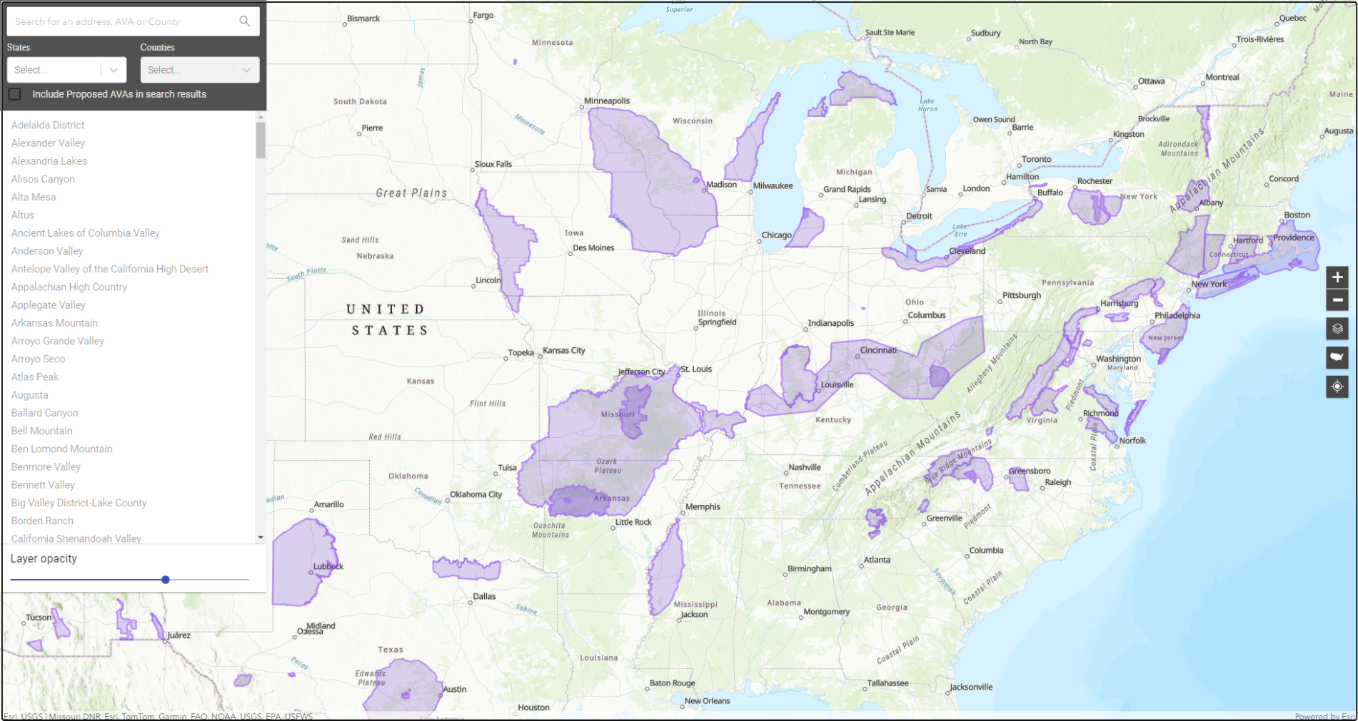 一个愉快的方式,消磨几分钟(如果你真的很喜欢的话,也可以消磨几个小时),就是访问由财政部的酒精和烟草贸易税务局(TTB)主办的美国葡萄种植区地图浏览器。这些官方葡萄酒产区的最大集中地——更轻松的法国AOC产区的表亲——不出所料,位于加利福尼亚州。最著名的是纳帕谷美国葡萄种植区。但现在大多数其他州也都有这样的产区。