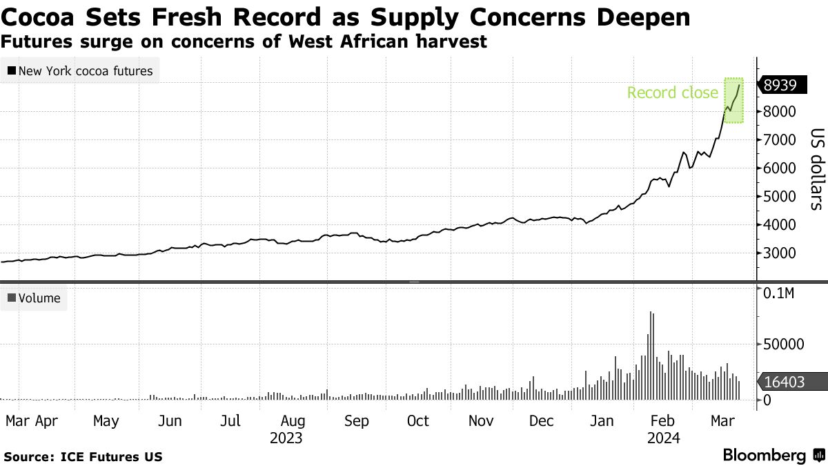 随着复活节假期的临近,巧克力蛋和兔子的价格越来越昂贵 —— 而明年可能会更糟,因为可可价格持续飙升。这种甜食的期货价格飙升,日复一日创下新纪录,使可可成为最热门的大宗商品。这次激增的主要原因是西非干旱和疾病导致的糟糕收成,这些问题由数十年的投资不足和对数百万贫困可可农民的支持不足恶化。周一,纽约的可可期货价格一度飙升至每公吨9250美元,创下新的盘中纪录。