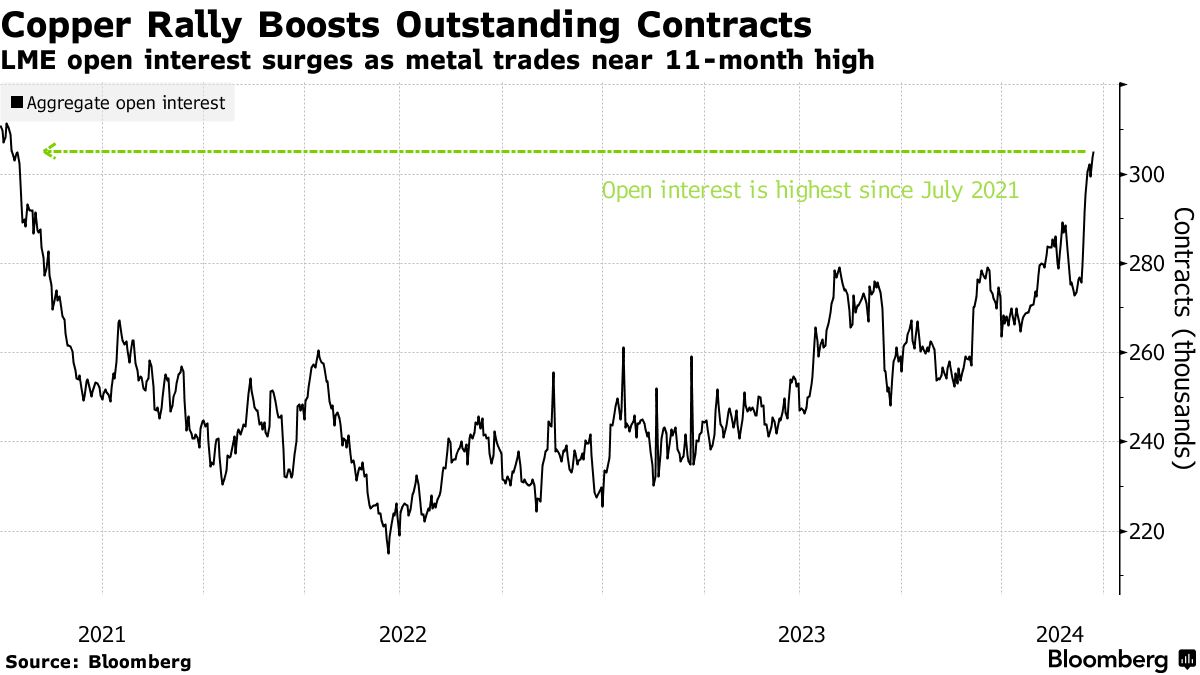 铜最近的上涨推动了伦敦金属交易所的持仓量激增。上周未平仓合约数量飙升至30万以上,是2年半以来最高,表明买家需求强劲。这种导电金属在过去6周内上涨了8.5%,投资者关注矿山和冶炼厂供应风险以及更积极的全球经济前景可能提振需求。在上海期货交易所创下纪录后,Comex的未平仓合约也飙升至3年多来的最高水平。