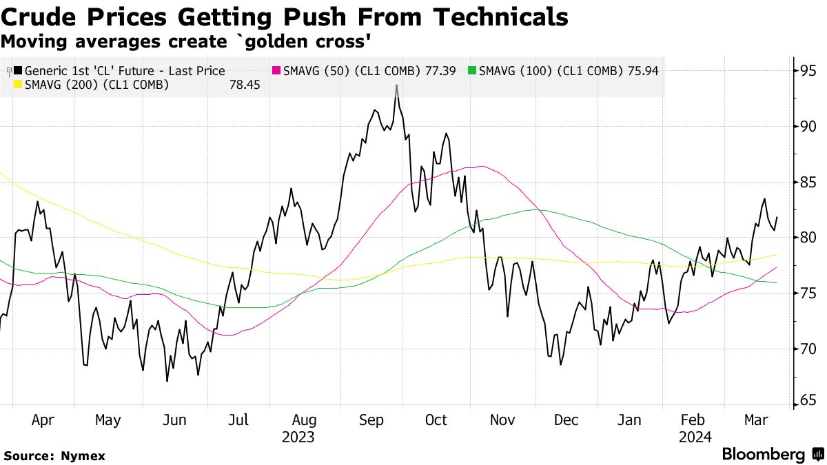 技术指标也在推动原油走高,其50日移动平均线超过了100日移动平均线,形成了被称为“黄金交叉”的图表模式。