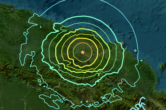美国地质调查局发布的关于2024年3月25日巴布亚新几内亚发生的6.9级地震的“震度图”。