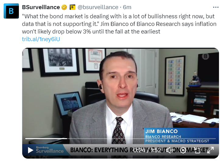 对于Bianco Research的Jim Bianco来说,对债券保持谨慎是有理由的。他表示,只需出现几个比预期更高的通胀数据,市场就会逐渐接受美联储允许价格持续上涨的现实。