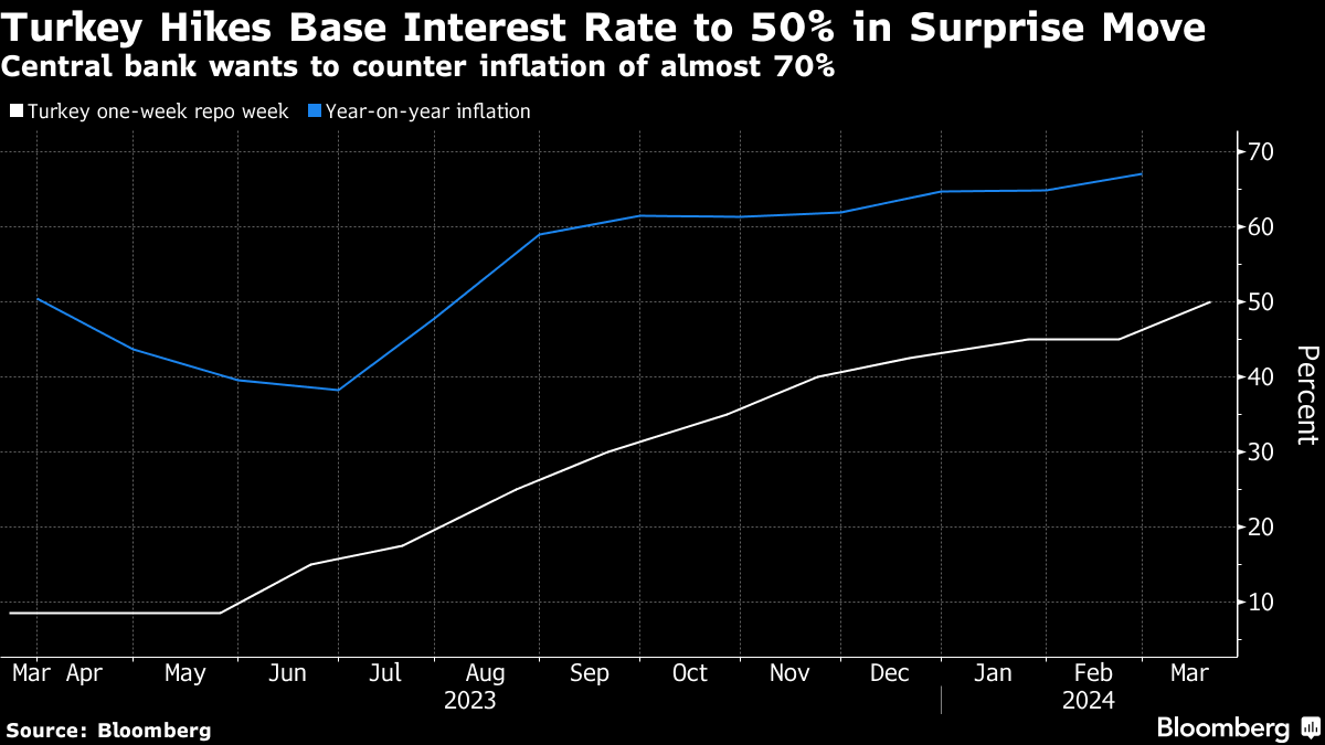 土耳其央行在关键地方选举前几天将利率上调 500个基点,因为通胀仍有望超过70%。