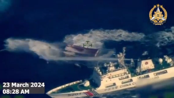 中国海警船于3月23日在南中国海向前往第二托马斯滩的菲律宾补给船Unaizah May 4开火。来源:菲律宾武装部队菲律宾抗议中国船只在南中国海采取“侵略性行动”,在周末召见了驻马尼拉的北京使节,随着两国在有争议水域的紧张局势升级。