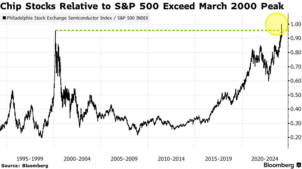 费城证券交易所半导体指数的价格约为销售额的八倍,根据彭博社编制的数据,这是至少二十年来最高的。相比之下,S&P 500的价格约为销售额的3倍。与更广泛的基准相比,芯片指数高于2000年互联网泡沫时期。