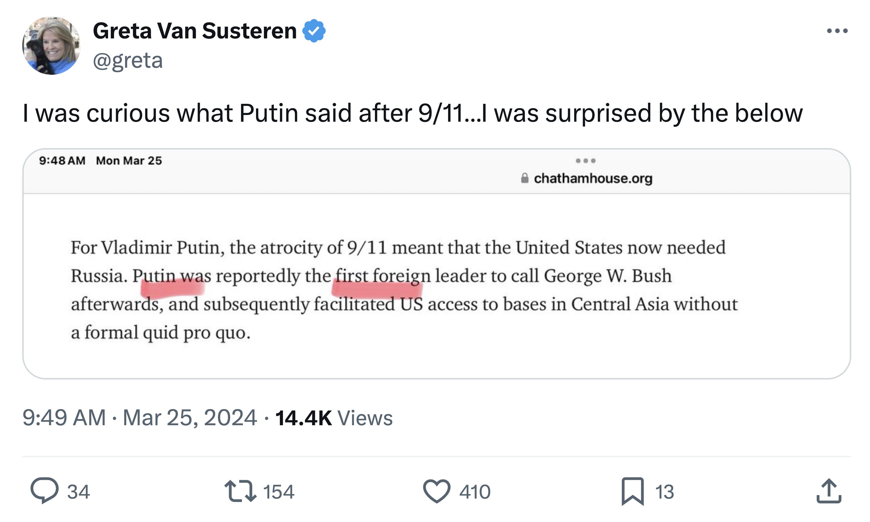 至少137人丧生在弗拉基米尔·普京盲目忽视了美国的警告关于莫斯科可能发生恐怖活动。“不久之前, 普京明白华盛顿认为伊斯兰激进主义是一个共同的威胁,被认为如此严重以至于被与其他争端隔离,”Marc Champion 写道(免费阅读)。“然而,自从普京2022年入侵乌克兰,甚至自从他2014年吞并克里米亚以来,莫斯科和华盛顿之间的信任已经破裂,他陷入了偏执。如果他能够理性思考,俄罗斯总统本应知道这是美国不会玩的游戏,因为它只会输。” 相反,普京模糊地将关于即将发生伊斯兰袭击的美国情报称为“勒索”。我知道事后诸葛亮,但哎呀。