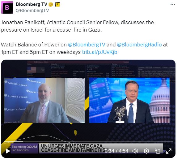 今天在彭博电视台的权力平衡 早间版节目中,主持人乔·马修和凯利·莱因兹采访了大西洋理事会斯考克罗夫特中东安全倡议主任乔纳森·帕尼科夫,谈到以色列在加沙停火压力下的情况。