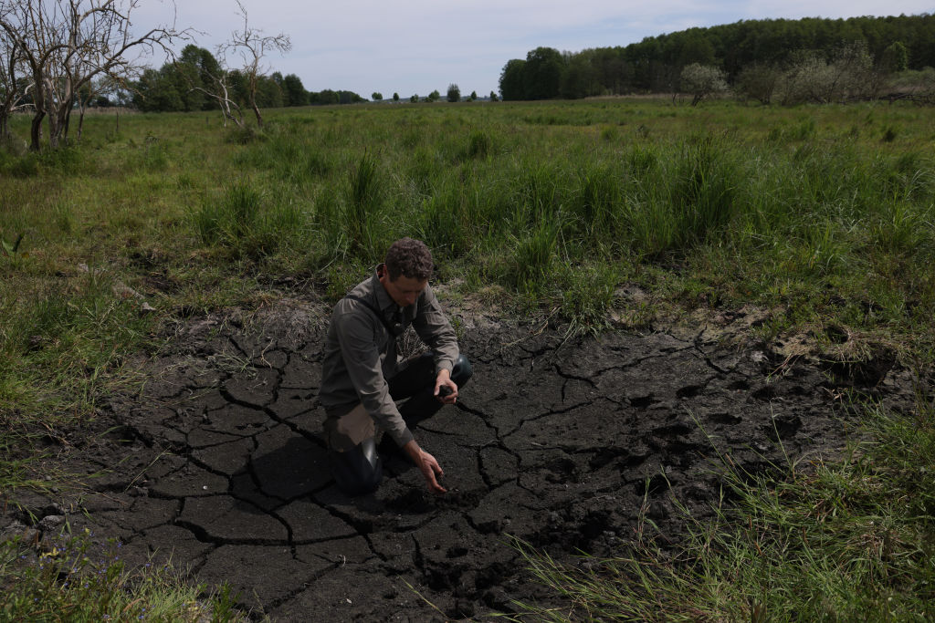 Fabian Frucht,Succow Stiftung基金会的土地经理,站在由于最近干旱天气而开裂和干燥的泥炭地上,这片泥炭地位于德国Greiffenberg附近的Sernitzmoor泥炭地的约300公顷的部分上,2023年5月31日。