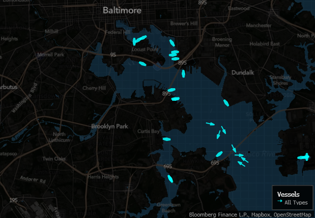 事故发生时,有七艘货船停泊在桥上游的码头。根据彭博社编制的船舶跟踪数据,其中包括三艘散货船、一艘汽车运输船、一艘沥青/沥青运输船和两艘普通货船。