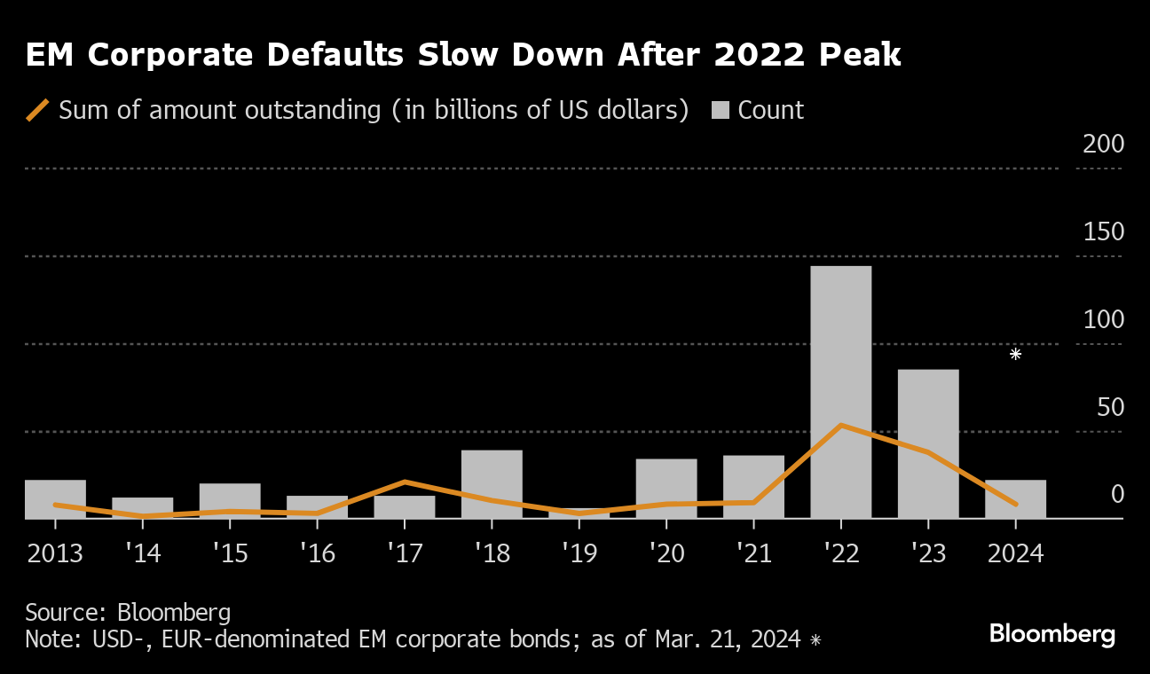 到目前为止,根据彭博社编制的数据,2024年新兴市场企业违约金额为82亿美元,而2023年同期为150亿美元。