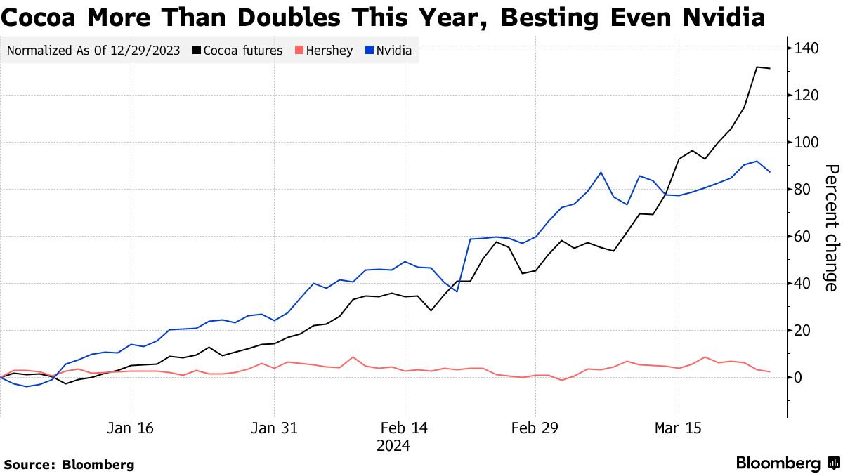 今年可可期货价格翻了一番多,上涨到周二首次突破每吨10000美元,然后抹去涨幅,暂时停止历史性的涨势。这种大宗商品的表现超过了股市中的最高飞行者,包括英伟达公司。与此同时,好时公司股价自1月初以来仅上涨了2.4%,表现不及标普500指数和大型消费品指数。