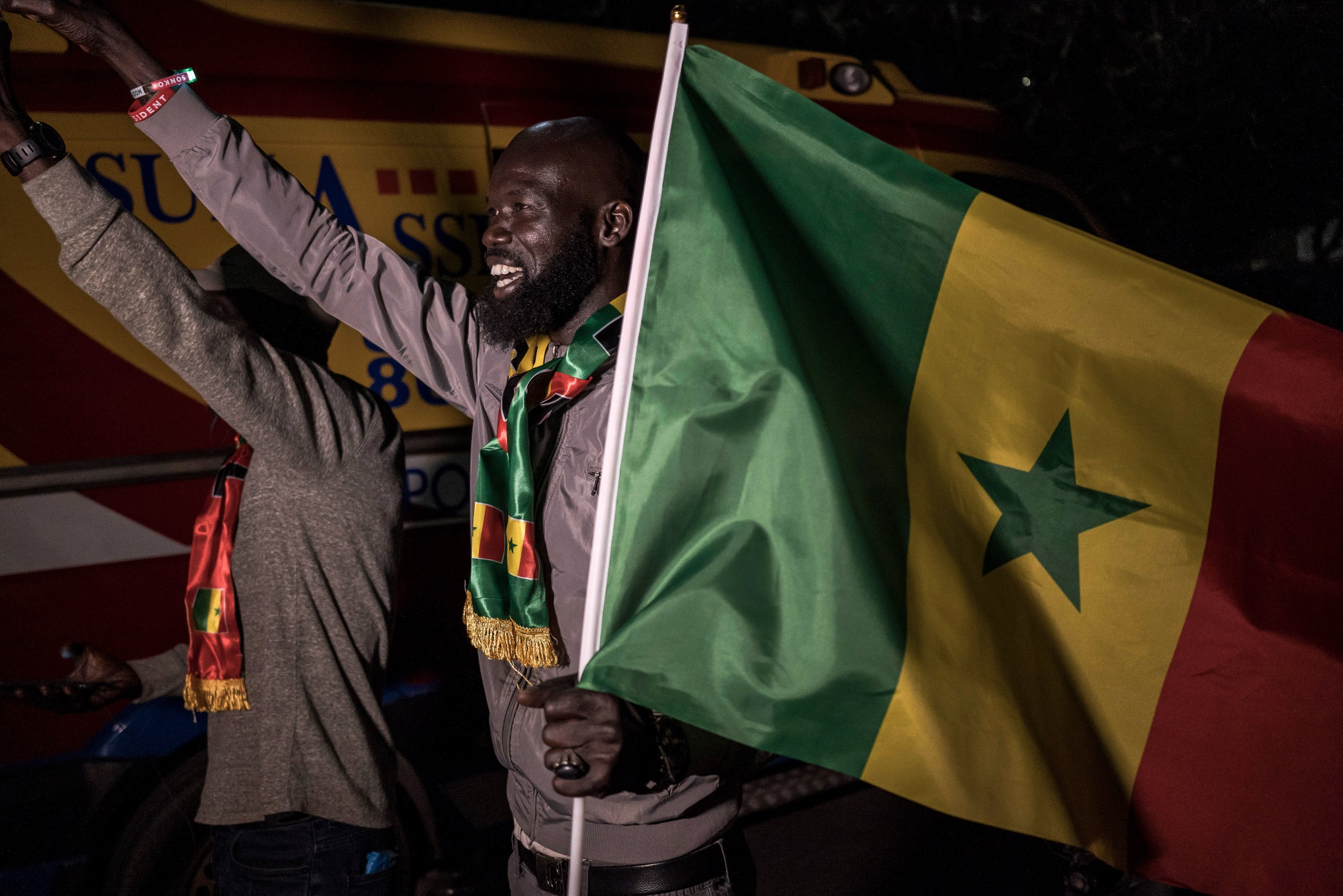 巴西鲁·迪奥迈·法耶的支持者在3月24日的达喀尔举着塞内加尔国旗。