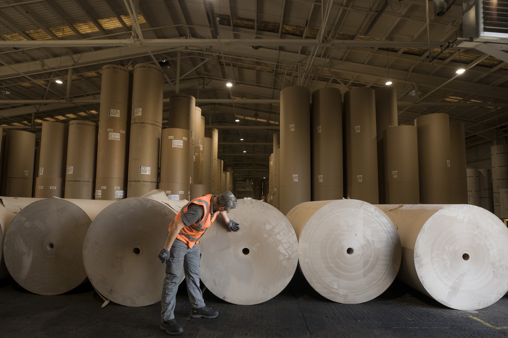 英国肯斯利DS Smith Plc工厂的纸卷。摄影师:Jason Alden/DS SmithDS Smith Plc确认与美国竞争对手国际纸业公司进行谈判后,股价上涨,引发了对这家英国包装公司可能发生的竞标战。