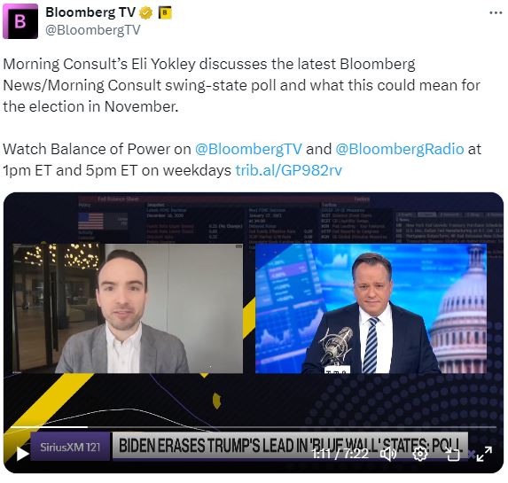 今天在彭博电视台的 权力平衡 早间版节目中,主持人乔·马修采访了晨晖咨询公司的伊莱·约克利,谈论了最新的彭博新闻/晨晖咨询公司摇摆州民意调查。
