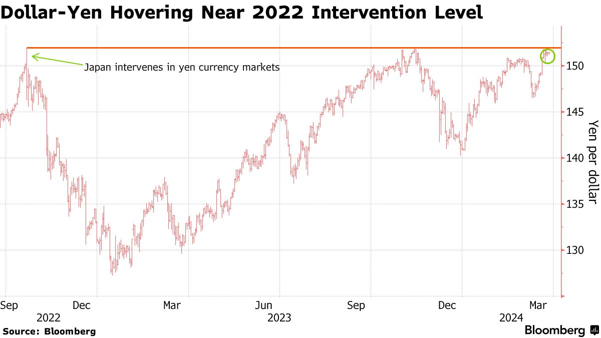 这对货币本周交易在151左右,根据彭博智库首席十大外汇策略师奥德丽·奇尔德-弗里曼(Audrey Childe-Freeman)的说法,可能会向155推进。如果达到152至155的范围,美国银行公司认为干预风险正在上升,而经济学家的一项彭博调查发现,可能会促使财政部干预的日元水平的中位数估计为155。