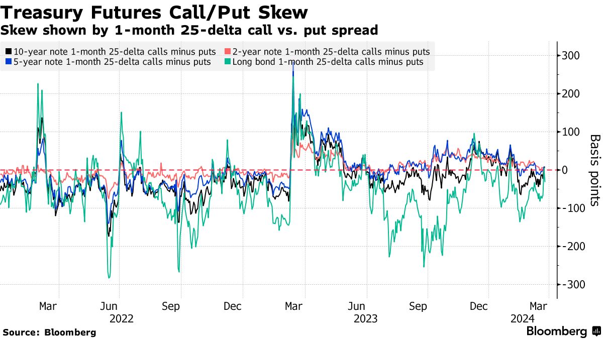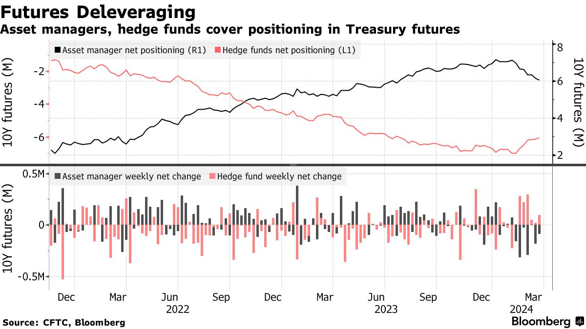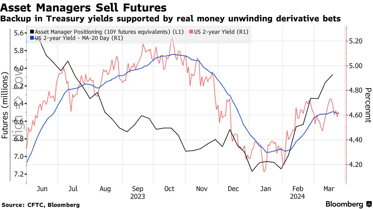 根据截至3月19日的CFTC数据显示,这种卖压与自2月初以来美国国债收益率上升相匹配,投资者推迟了对降息的预期,因为报告显示通胀持续存在。除了导致国债抛售外,期货的减仓也表明一些资产管理人员可能在减少基差交易——这种交易旨在从国债和期货价格之间的差距中获利——而转向信贷。