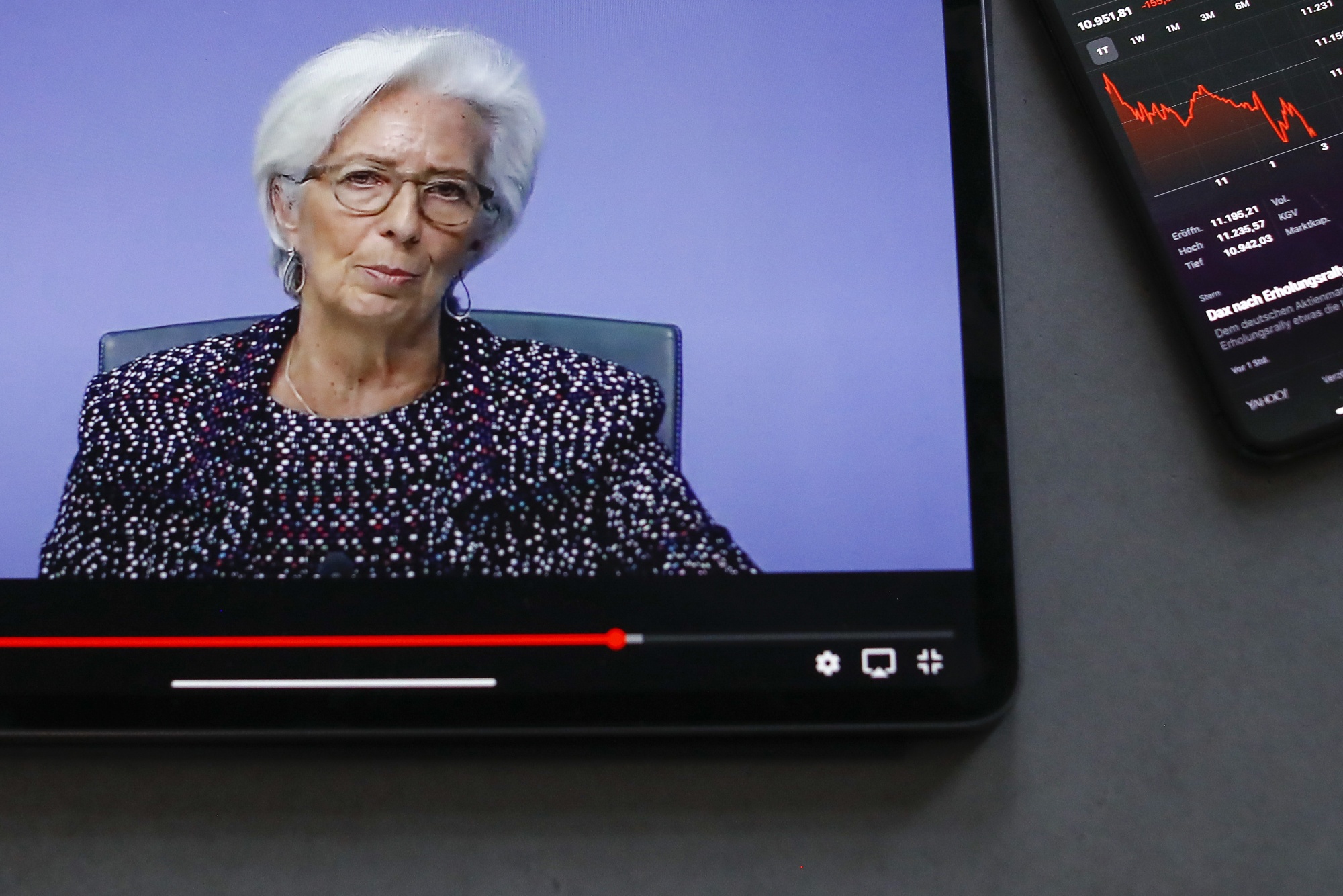 欧洲央行行长克里斯汀·拉加德在2020年4月30日新冠危机的高峰期显示在平板设备上。