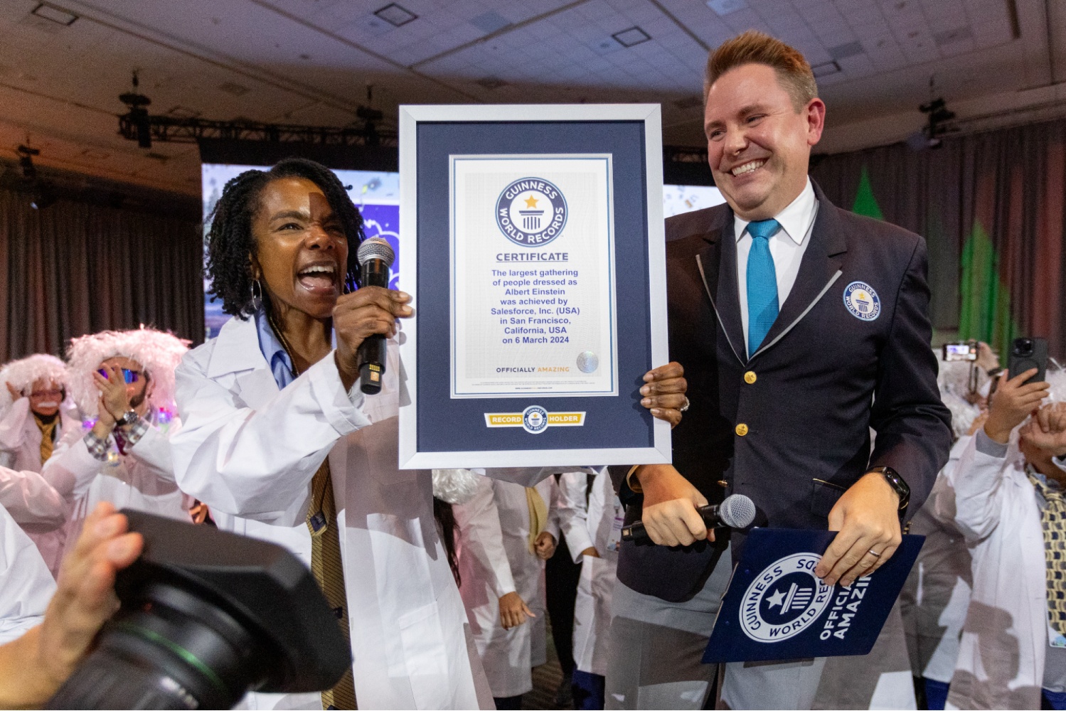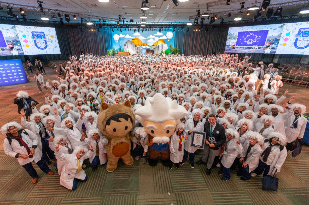 Salesforce召集了885名穿着像爱因斯坦的拓荒者,创下了吉尼斯世界纪录。来源:Salesforce, Inc.将近十年前,Salesforce的营销人员被要求为不连贯的人工智能功能制定品牌身份,比如一种工具,可以预测哪些销售前景可能真的购买东西。Salesforce的营销主管科林·弗莱明表示,最初提出了“无聊”的名称,比如Compass或Salesforce AI。