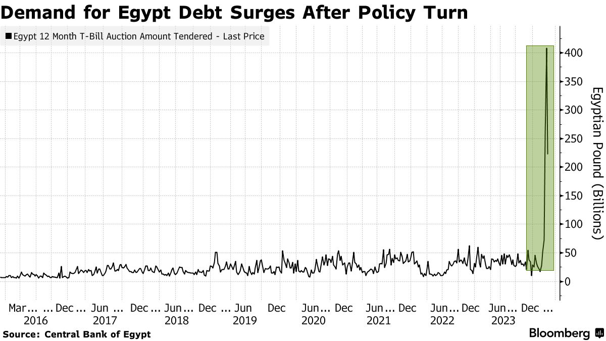 在3月6日埃及货币贬值后,用于国债拍卖的竞标量激增至历史高位,因为进一步货币贬值的风险消散,持有它们的溢价创下了其他新兴市场债券的历史纪录。本月一次拍卖中,对364天期国债的需求跃升至4000多亿埃及镑(85亿美元),创下历史新高,投资者对各期限的债券需求强劲。