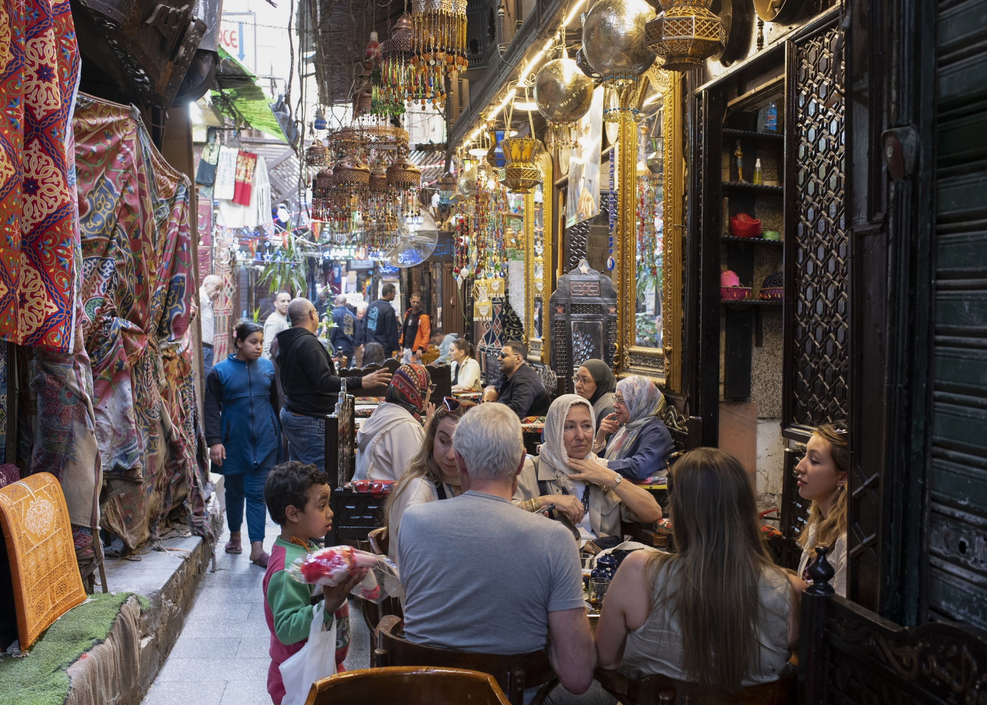 在埃及开罕哈利利市场的一家咖啡馆里的游客。