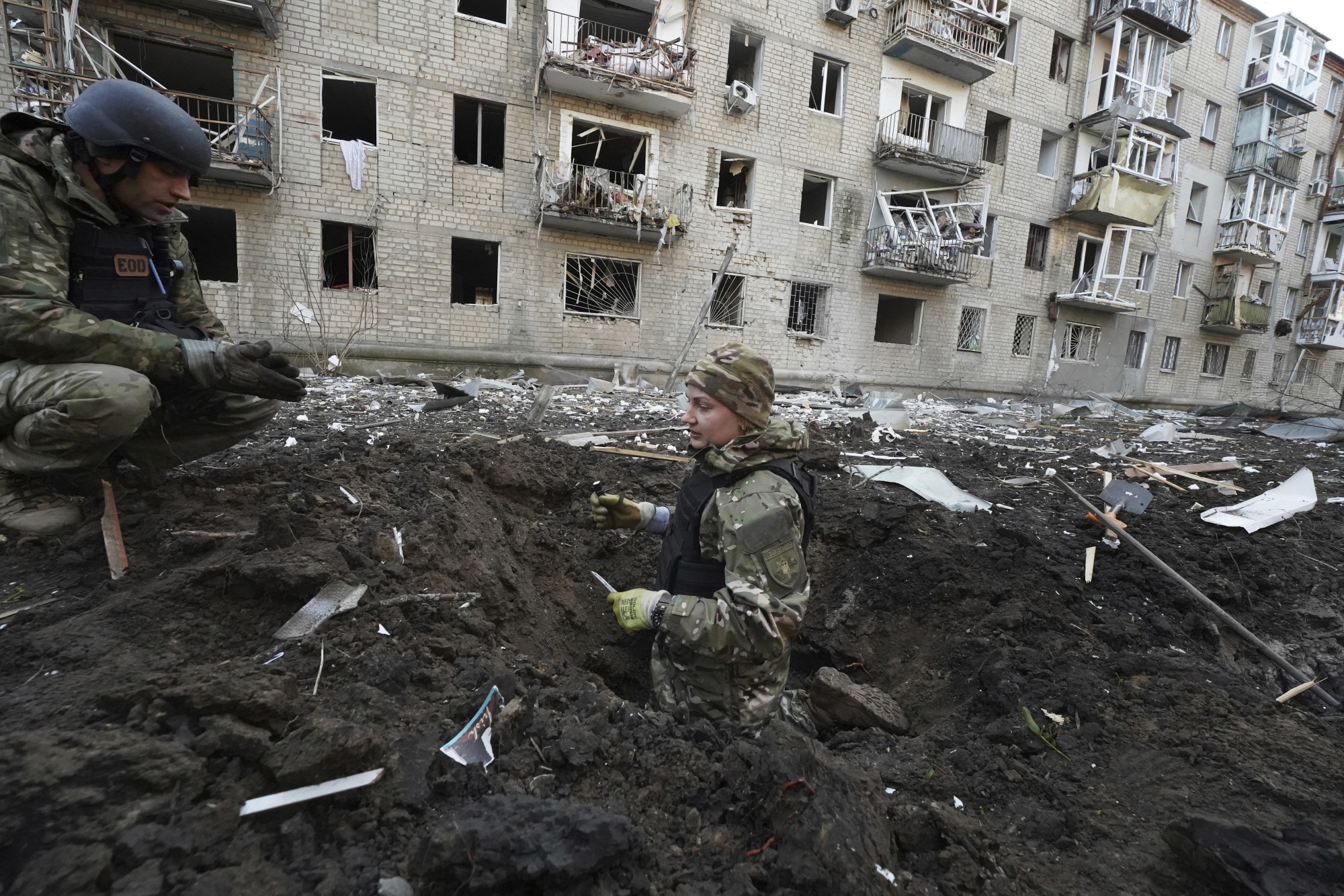 警察在乌克兰哈尔科夫一处被俄罗斯袭击的受损住宅楼前检查弹坑,日期为3月27日。摄影师:安德烈·马连科/美联社照片乌克兰总统弗拉基米尔·泽连斯基正在俄罗斯边境附近苏梅地区进行前线巡视,他呼吁增加爱国者导弹防空系统。