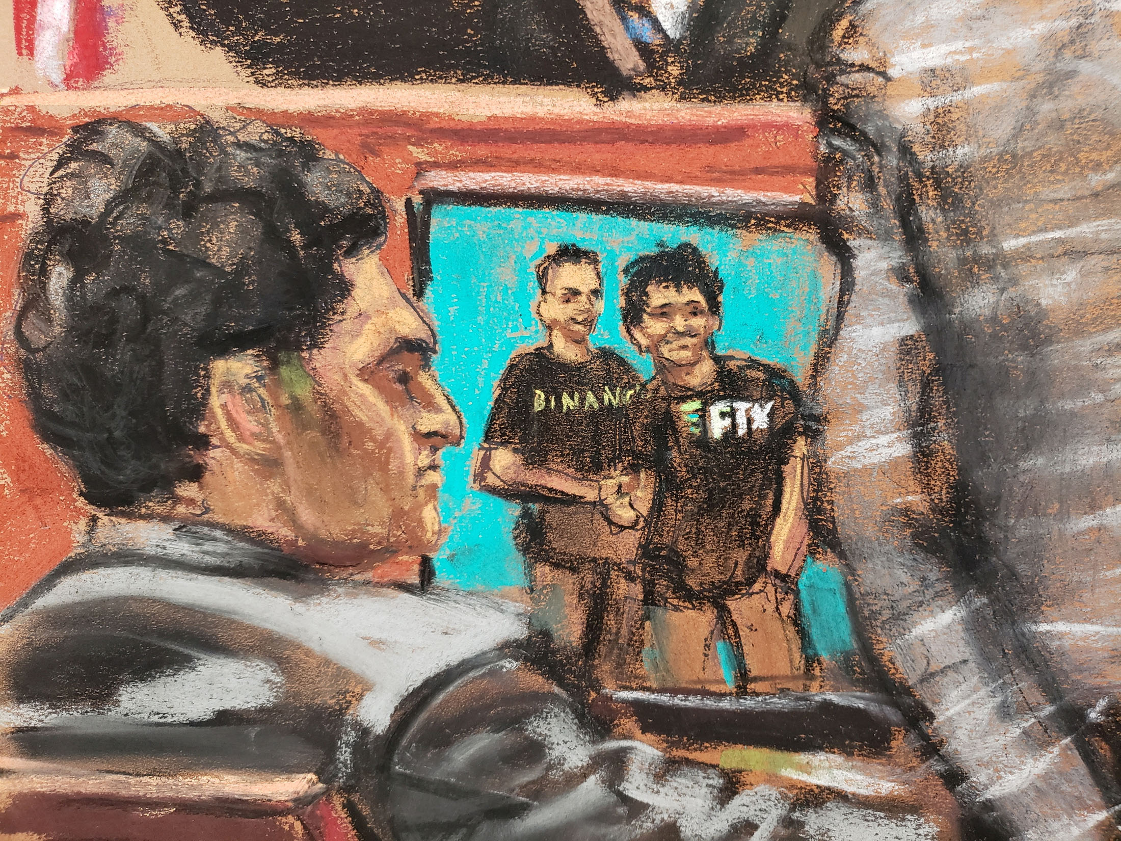 法庭素描:2023年10月10日,班克曼-弗里德坐在一个屏幕旁,屏幕上显示他与币安CEO赵长鹏握手。摄影师:简·罗森伯格/路透社想象加密货币交易就像一场视频游戏。班克曼-弗里德肯定这样认为。他对游戏的痴迷贯穿了刘易斯畅销书 无限增长:一个新大亨的兴衰,甚至连他自己的投资者也知道,他在一个推介会上被发现在玩 英雄联盟。动用FTX客户资金就像打开了无敌模式。这让他可以像永远不会输一样赌博,像永远不会破产一样花钱。他迅速冲向亿万富翁地位,以至于一位科技博主将其比作 《塞尔达传说》的速通*。*
