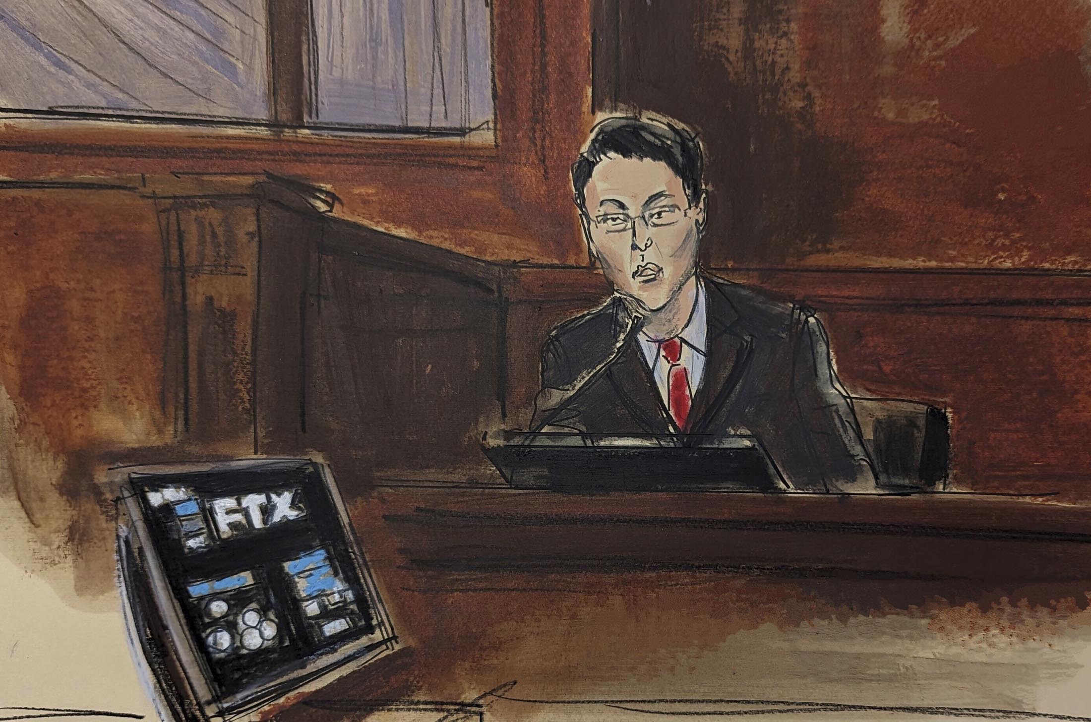 法庭素描:Gary Wang在2023年10月6日的班克曼-弗里德审判中作证。摄影师:Elizabeth Williams/AP Photo对他来说,事实是显而易见的:“阿拉米达在占用客户的资金,”Wang作证说。