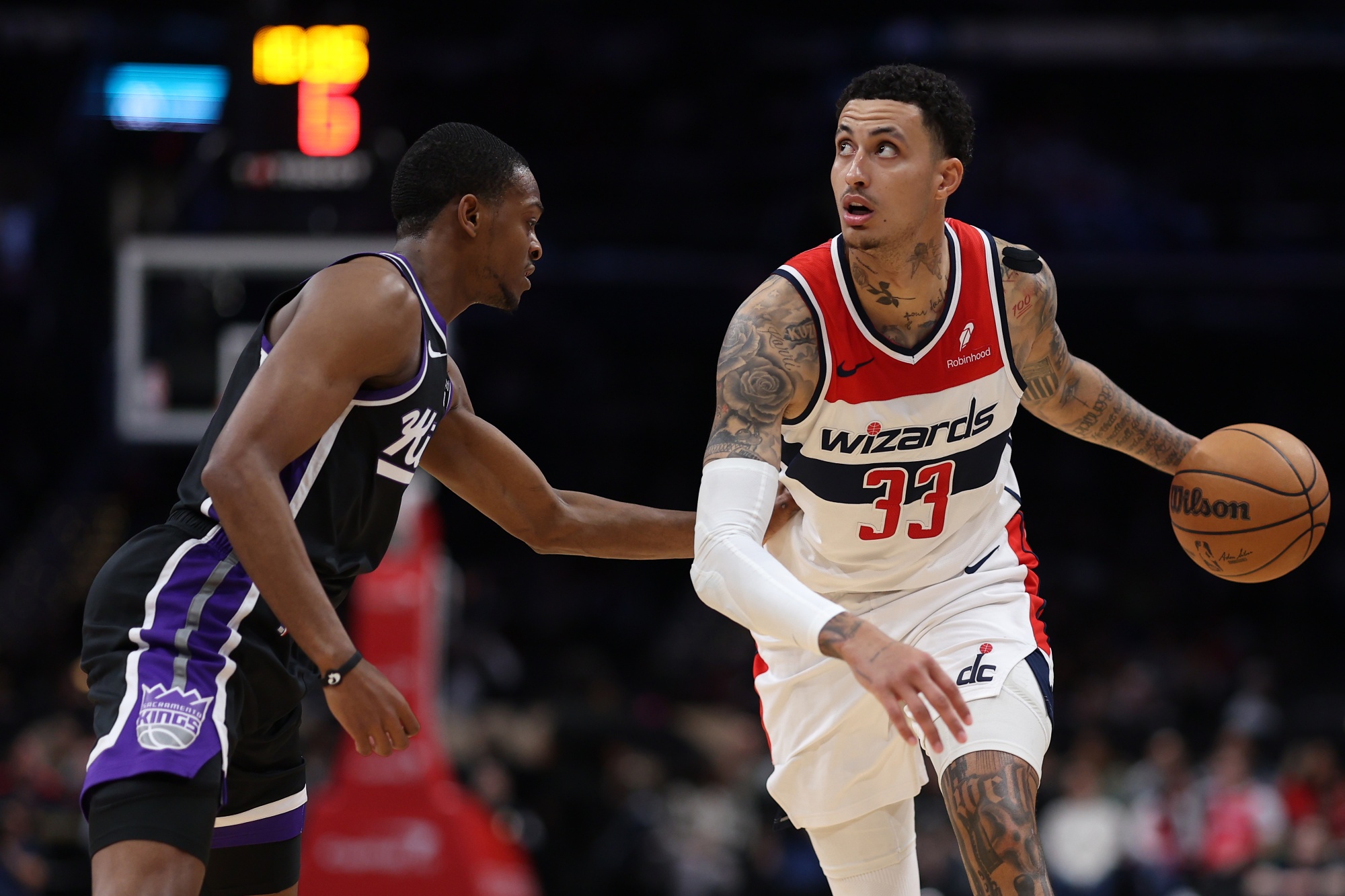 华盛顿奇才队的凯尔·库兹马在3月21日在华盛顿的一体育馆内上半场比赛中。