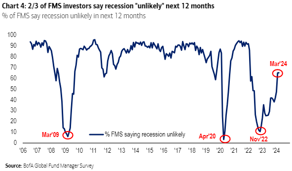 这与美国银行公司每月全球基金经理调查的结果大致相同。虽然问题略有不同,但得出的结果基本相同。约三分之二的受访者现在表示,在接下来的12个月内不太可能出现衰退。进入去年,他们曾将这视为几乎必然发生的事情: