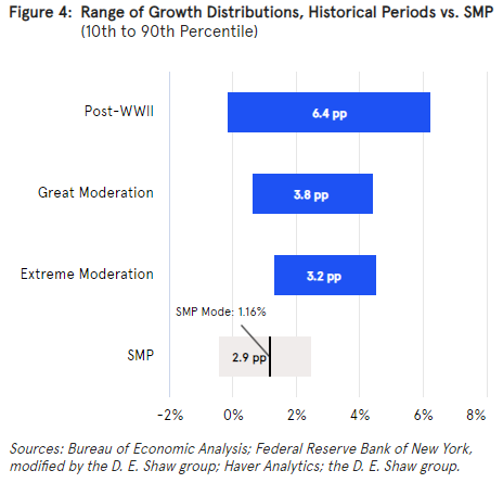 因此,这种新发现的信心看起来有点过度。这方面的更多证据来自对冲基金集团DE Shaw的一篇论文,该论文比较了经济学家为纽约联邦储备银行定期调查(称为SMP,市场参与者调查)报告的增长和通货膨胀估计。最新的增长预测显示在橙色条中;战后时期各种结果的总体范围显示在蓝色中。经验表明,离群值比经济学家现在认为的更有可能发生: