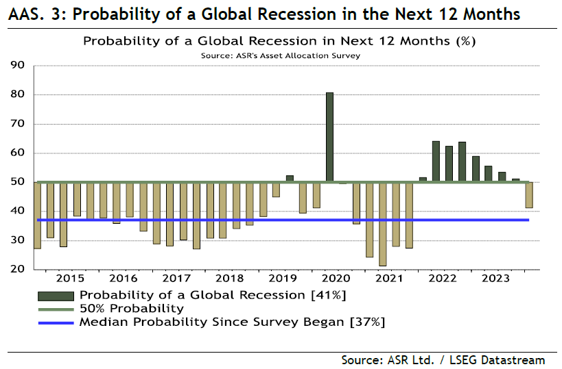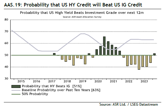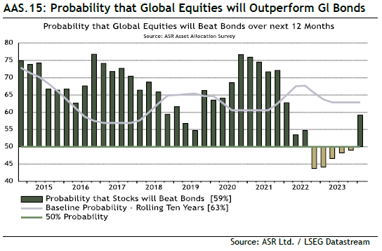 目前,资产配置者有足够的信心打赌股票将在未来12个月内击败债券。这是在债券在过去五个连续季度被(错误地)预期会表现优异之后的一次转变。为了应对经济放缓而进行的降息通常会确保债券表现良好,而股票则会遭受损失;因此,这与对“更长时间内更高”由于经济实力的信念是一致的: