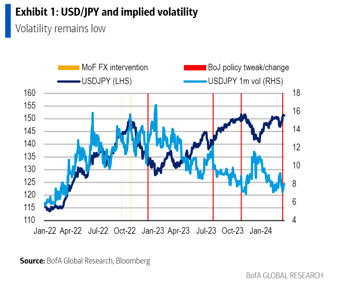 如果美联储在六月降息,导致美国收益率在各个期限上回落,那么可能甚至不需要干预。美国经济的强劲表现使得这种情景变得不太可能。资本经济学家乔纳斯·戈尔特曼认为,日本不应该寄希望于美联储;风险现在偏向于更少和更晚的降息,这可能会进一步削弱日元。