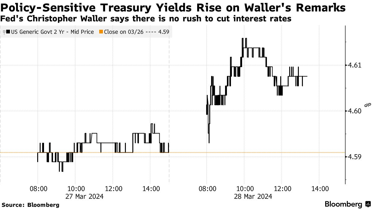 - 美国国债下跌,因为美联储理事克里斯托弗·沃勒强调最近的美国数据可能会延迟今年看到的降息次数。
