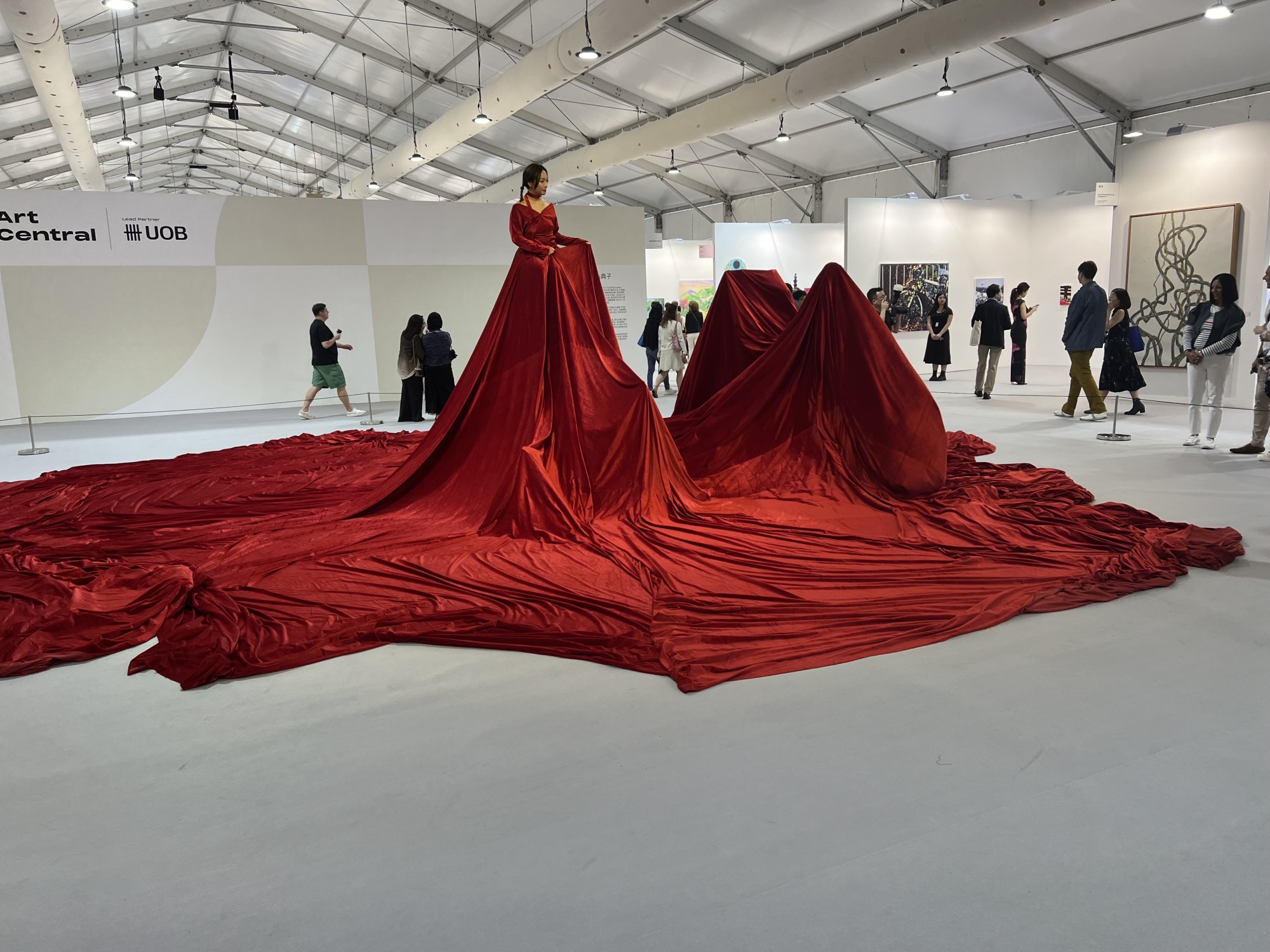 有许多替代品可供选择。这是在Art Central穿着一条大红裙子的女士。摄影师:Madeleine Lim/Bloomberg如果巴塞尔艺术展真的不适合你,这个周末城市中还有许多其他艺术活动,包括Art Central,在K11 Musea有13位新兴当代艺术家的大型展览。值得一提的还有M+、太空馆和亚洲艺术档案馆。 —Filipe Pacheco 和 Krystal Chia*,在* Stella Ko*、* Venus Feng 和 Kristine Servando