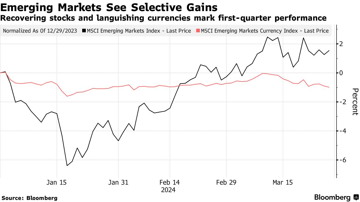 新兴市场在第一季度结束时充满了转机故事,股票和美元债券投资者带着适度的回报离开,尽管市场仍在等待一场持续的涨势,但当地债务和货币仍未迎来复苏。