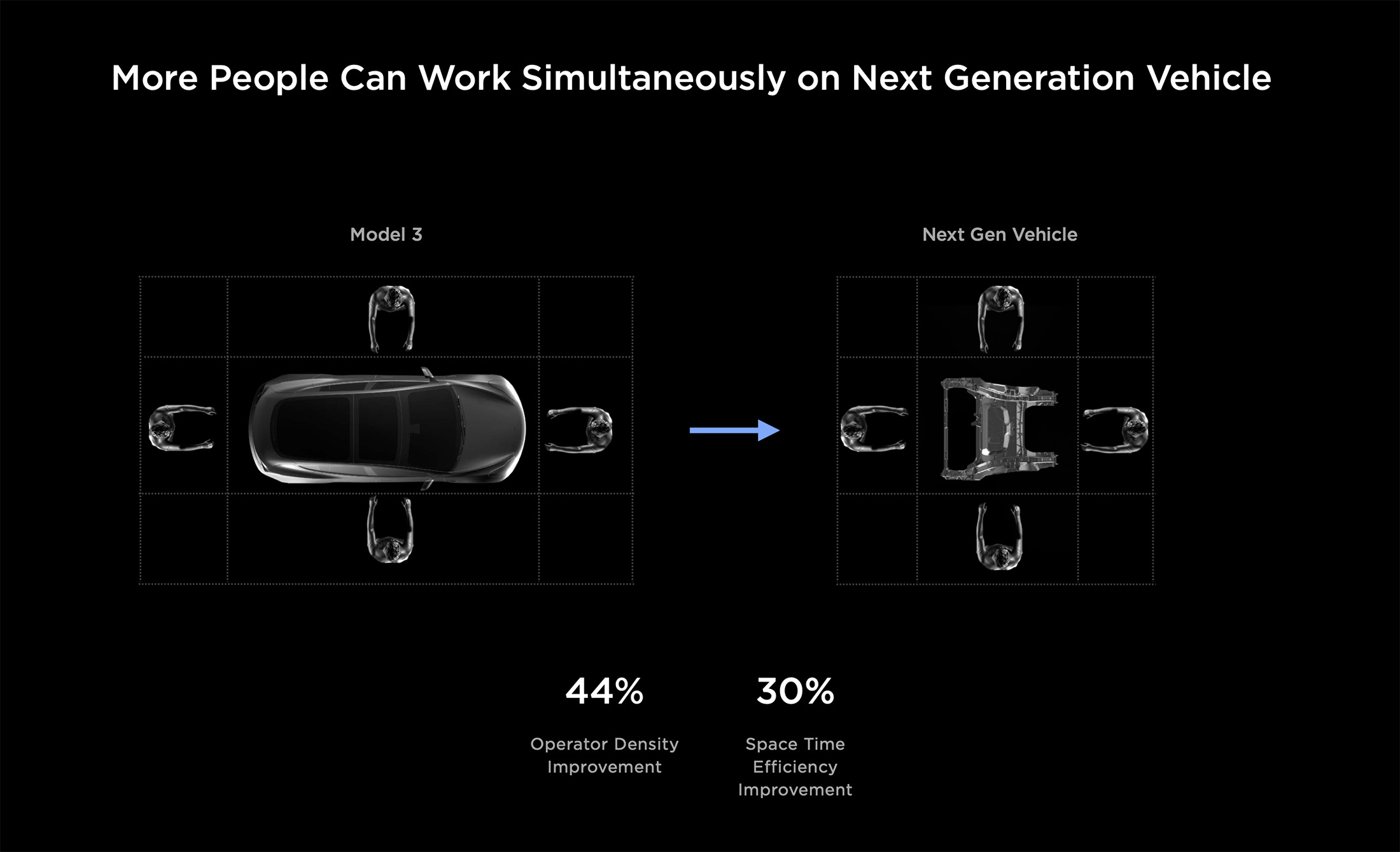 该公司正在转向它所称的“无箱”方法,这更像是搭积木而不是传统的生产线。零部件不再沿着线性传送带移动,而是在专用区域同时组装,然后在最后组装在一起。特斯拉表示,这种改变可以将制造占地面积减少40%以上,使汽车制造商能够更快地建造未来的工厂,并且成本更低。