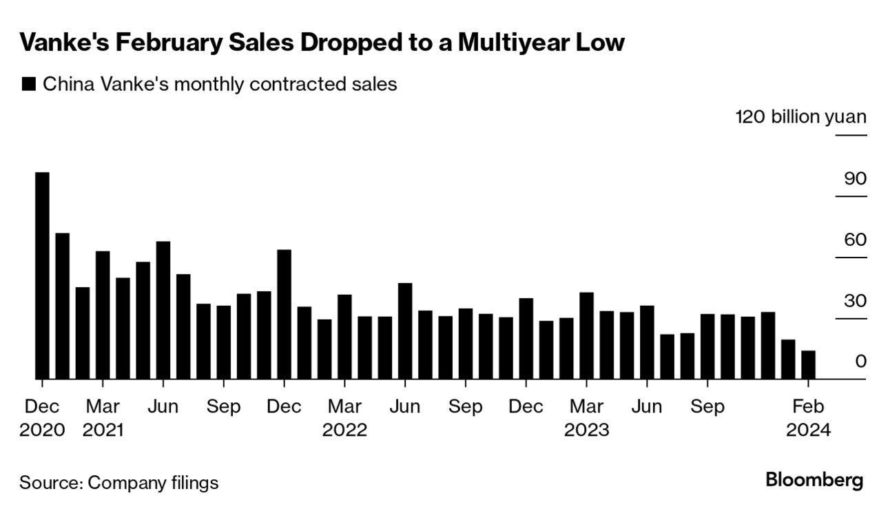 万科上个月出现了至少六年来最大的销售下滑,加剧了其流动性紧张。二月份的签约销售额较去年同期暴跌53%,仅为140亿人民币。