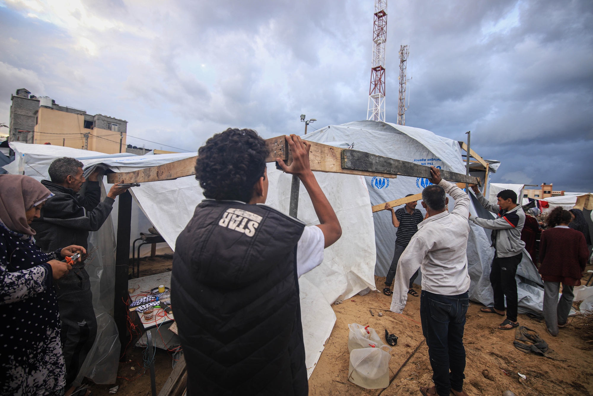 被迫害的巴勒斯坦人在联合国救济和工程机构(UNWRA)运营的营地内准备临时住所,时间是2023年。