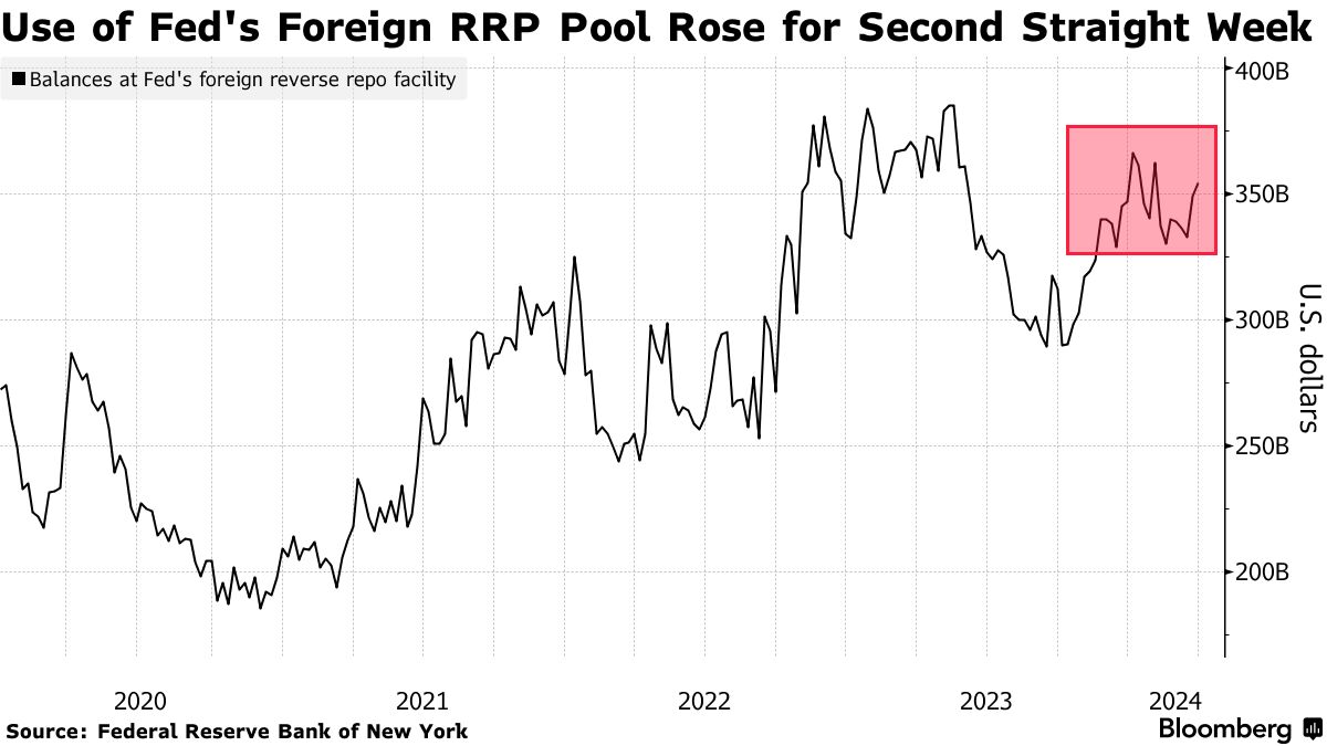 在2022年10月日本干预捍卫日元之前,各国央行一直在增加存放在外汇逆回购市场的现金金额,当时达到了创纪录的3330亿美元。然后,当月晚些时候,这些余额下降了五个月来最多的一次。