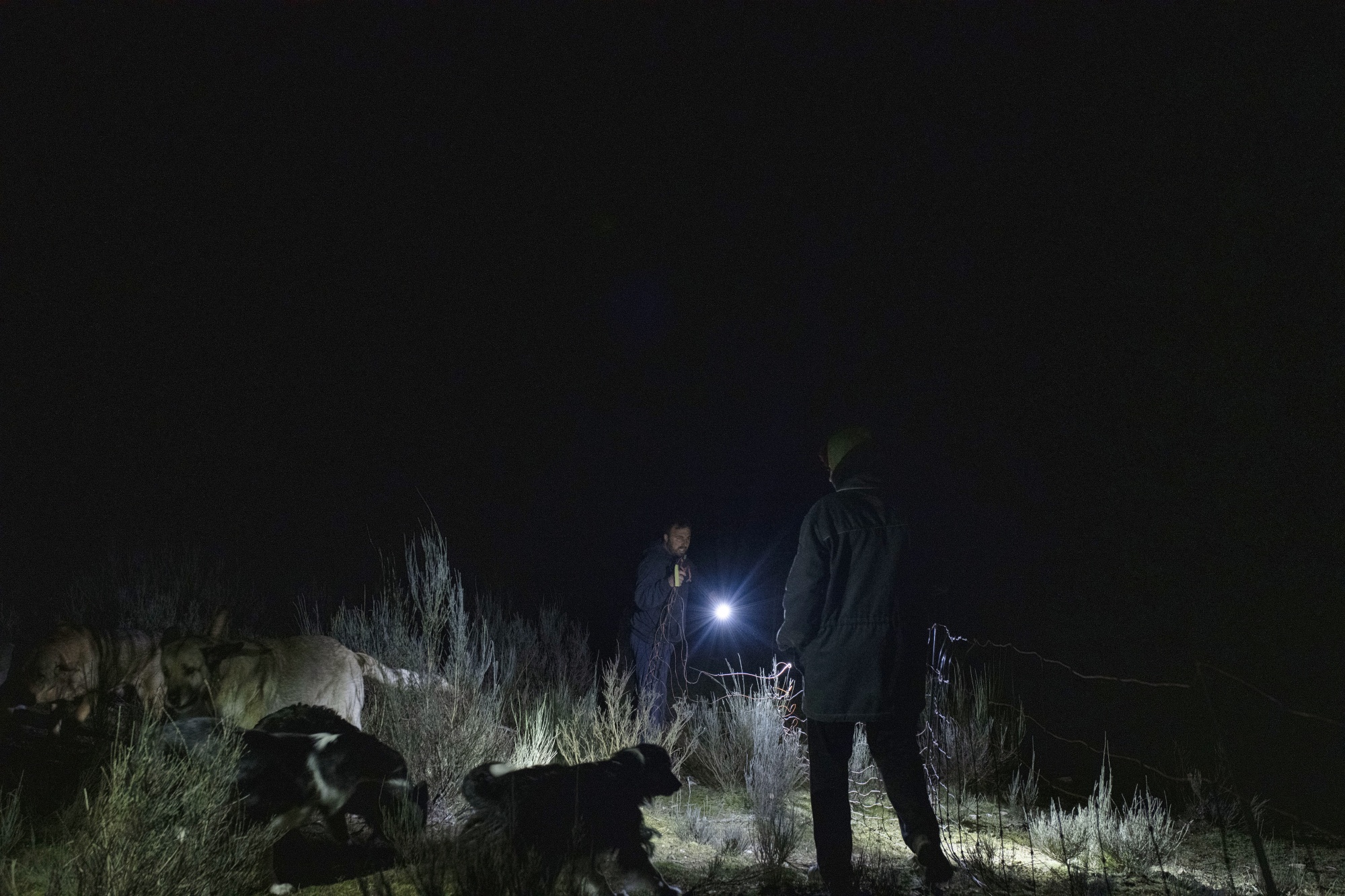 周围的山丘漆黑一片,但羊群看起来很平静;狗、人类和嗡嗡作响的引擎让它们感到安全。Fernández 只见过一次狼的轮廓在羊群附近嗅探,立刻就有一只獒犬追赶它。