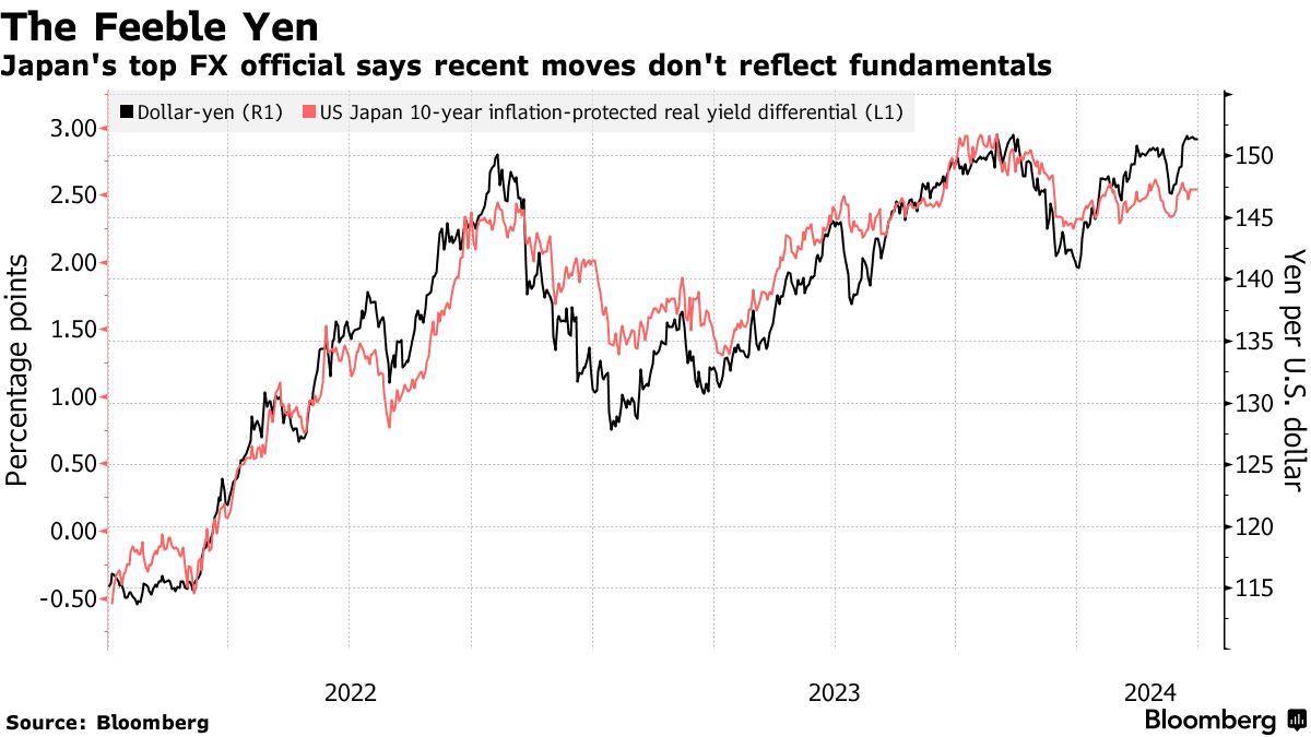 “我强烈感觉到最近日元急剧贬值是不寻常的,考虑到通胀趋势和展望、日本和美国货币政策和收益率的走向等基本面因素,”负责国际事务的副财政大臣神田雅人在周五的一次采访中表示。“许多人认为日元目前的走势与其应该走的方向相反。”