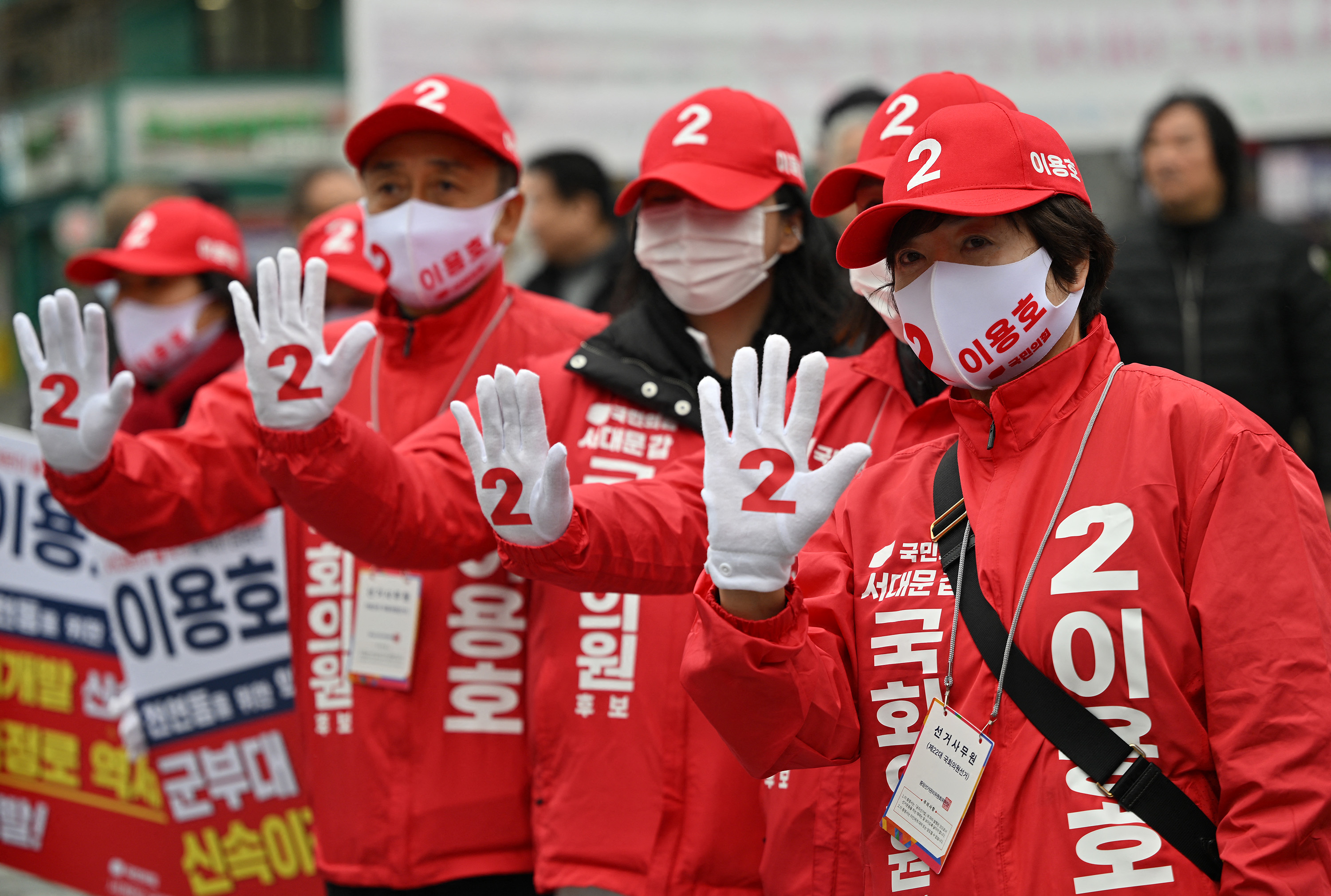 韩国执政党人民力量党竞选人员在3月28日首尔举行的议会选举前竞选时挥舞旗帜。