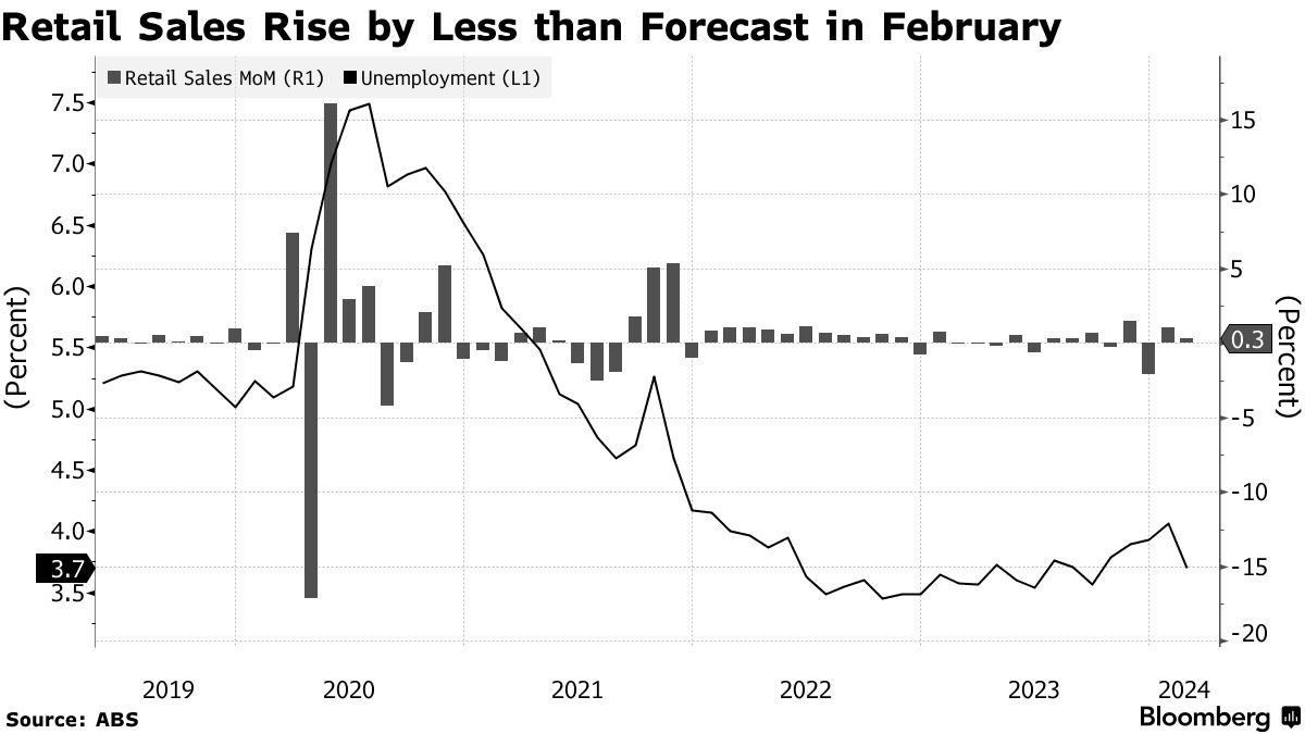 澳大利亚零售销售在2月份有所放缓,因家庭对财务状况仍持谨慎态度,通胀仍处于较高水平,利率为12年来最高。这些数据紧随显示澳大利亚通胀在2月份保持稳定的数据之后,而经济学家此前预测通胀会略有加速。