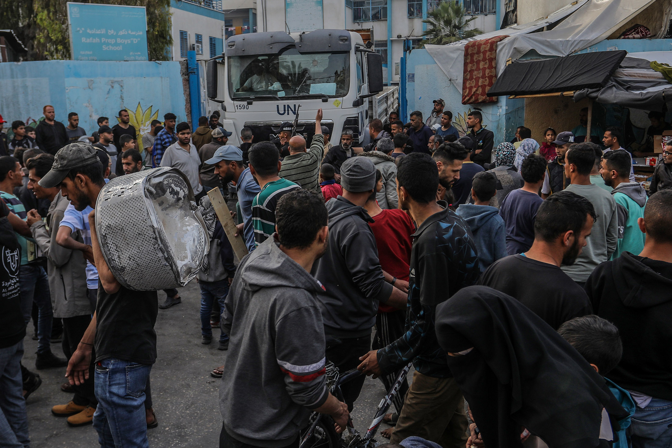 哈马斯行动人员在拉法阿的一所为被迫害的巴勒斯坦人提供援助的学校保护联合国救援卡车,时间是3月28日。摄影师:阿贝德·拉希姆·卡蒂卜/图片联盟/盖蒂图片社三月中旬,一名哈马斯高级警察指挥官会见了一群一直在占领本应供给饥饿巴勒斯坦人的援助物资的加沙家族首领。他告诉他们停止拿走这些物资,否则他们会被杀。一周后,这名指挥官被以色列军队杀害。
