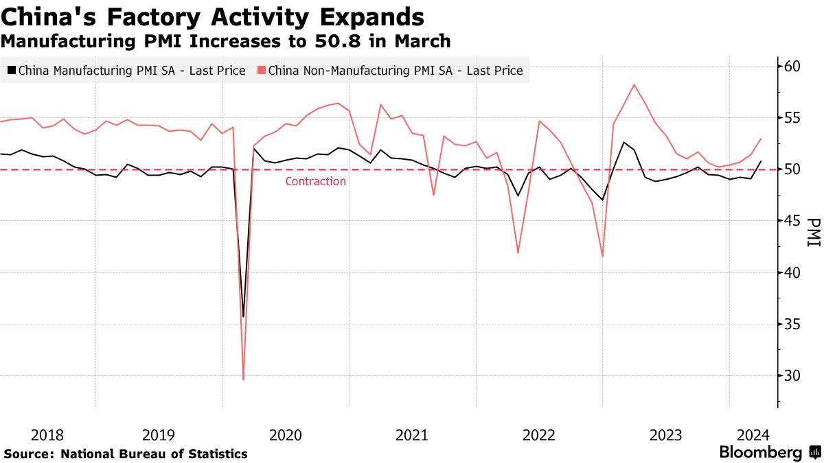 在中国,官方制造业采购经理人指数自9月以来首次扩大。这一数据表明,世界第二大经济体在年初良好开局后保持了增长势头,可能使决策者有更多时间评估之前刺激措施的影响。