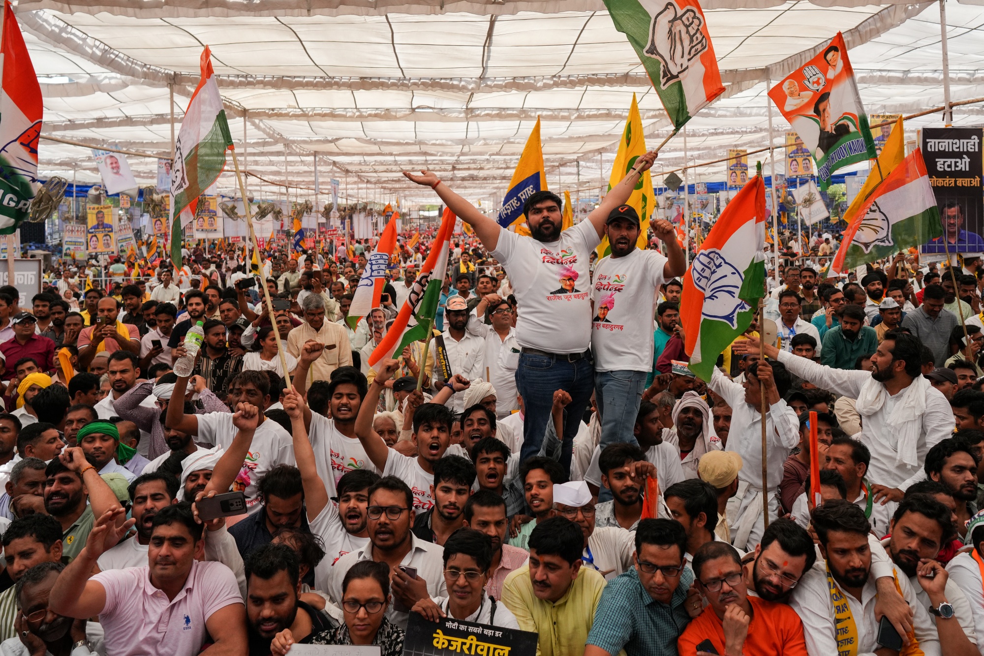 自去年形成广泛反对联盟以来,支持者大举出席,抗议印度总理纳伦德拉·莫迪及其人民党涉嫌的政治干预。在莫迪的人民党再次被看好赢得选举不到三周之前,这场集会在德里最大的公共场地之一举行。