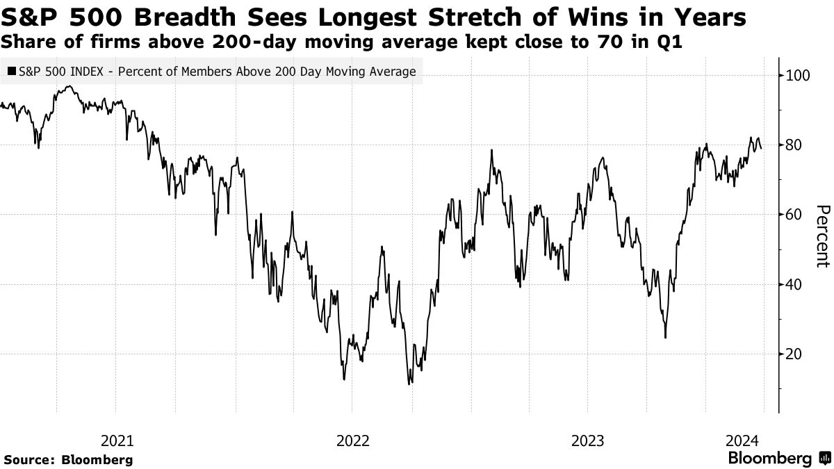 由于收益主要集中在一些关键股票上,投资者开始寻找市场中不太受青睐的价值。小盘股似乎即将复苏,而科技股为主的纳斯达克100指数在第一季度被更广泛的标普500指数击败,而在去年的每个时期都击败了它。为了了解改善的广度,大约70%或更多的标普500公司在每个交易日都保持在它们的200日移动平均线之上 —— 这是自2021年以来最长的时期。