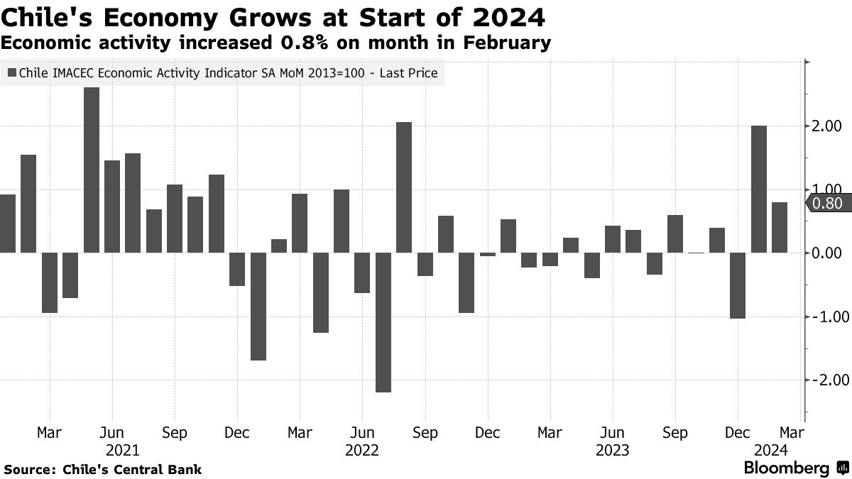 Imacec指数,作为国内生产总值的代理,2月份较1月份增长了0.8%,低于彭博调查中位数1%的估计。不过,央行周一报告称,1月份的环比增长修正为2%。