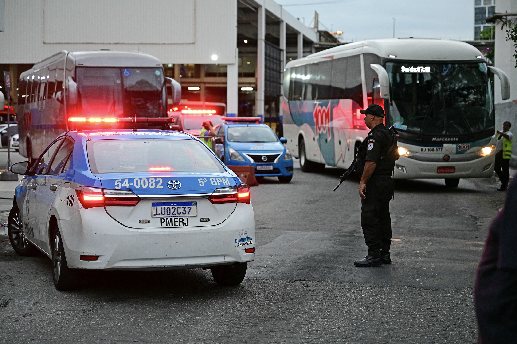 警察在2024年3月12日巴西里约热内卢新里约汽车总站外戒备,一名持枪歹徒劫持了乘客。